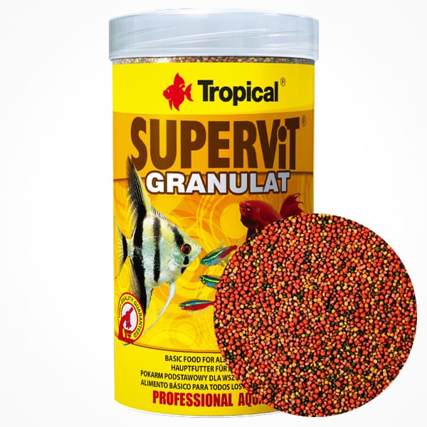 SUPERVIT GRANULAT kompletna, vrhunskog kvaliteta, granulirana hrana koja u sebi sadrži široku paletu hranjivih sastojaka . Služi za svakodnevnu ishranu akvarijumskih riba. Hrana sadrži prirodni stimulator imuniteta, BETA-1.3/1.6-GLUCAN, I stabiljizovani vitamin C koji u kombinaciji veoma efikasno poboljšavaju imunitet riba koji čuva organizam od raznih oboljenja. Celulozaa i hitin poboljšavaju digestiju I sprečavaju zatvore, karoten poboljšava boju a lecitin pojačava vitalnost organizma I stimuliše ribe na mrest. Hranjenje: dva do tri puta na dan u dozama koje ribe pojedu za dva do tri minuta. Completna hrana za ornamentalne ribe. Sastojci: riba I hranjivi sastojci poreklom od ribe, hranjive materije biljnog porekla, ekstrat biljnih proteina, lignje I rakovi , cerealije, meso I hranjivi sastojci poreklom iz mesa, alge, kvasci, ulja I masti , minerali. Vitaminski dodaci: vit. A 29 800 IU/kg, vit. D3 1 890 IU/kg, vit. E (alpha-tocopherol acetate) 100 mg/kg, vit. C (ascorbic acid phosphate) 500 mg/kg. Boje koje su dozvoljene po EU zakonima o dodatim supstancama. Sa antioksidansima dozvoljenim po EU zakonima o dodatim antioksidansima. Analiza sastojaka: ukupni protein 48.0%, ukupna masnoća 8.0%, ukupna vlakna 3.0%, vlaga 10.0%.